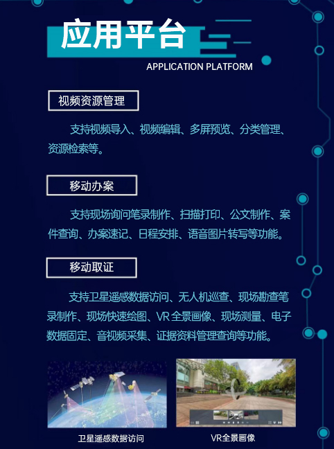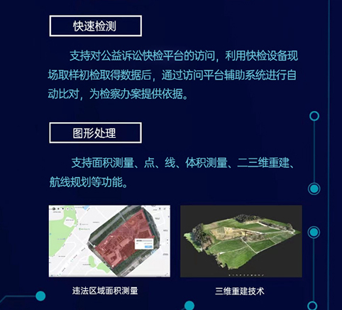 為了實現(xiàn)檢察機(jī)關(guān)公益訴訟一體化指揮辦案需求,推動公益訴訟檢察業(yè)務(wù)信息化和智能化建設(shè),針對公益訴訟檢察業(yè)務(wù)特點(diǎn),設(shè)計開發(fā)了符合其業(yè)務(wù)特色的檢察機(jī)關(guān)公益訴訟一體化平臺。該平臺依托公益訴訟移動指揮辦案取證一體機(jī),運(yùn)用衛(wèi)星遙感、無人機(jī)巡航、數(shù)字圖傳、現(xiàn)場勘查 VR虛擬全景畫像、5G移動通信、物聯(lián)網(wǎng)、移動檢測和三維模型重塑等先進(jìn)技術(shù),結(jié)合同步建設(shè)的沉浸式可視化指揮調(diào)度室、公益訴訟線索輔助管理平臺,構(gòu)成了檢察機(jī)關(guān)公益訴訟一體化指揮的三位一體模式。同時該平臺還可廣泛應(yīng)用于公安偵查、法院現(xiàn)場執(zhí)行、行政機(jī)關(guān)現(xiàn)場執(zhí)法辦案等場景是執(zhí)法辦案必備的輔助工具。